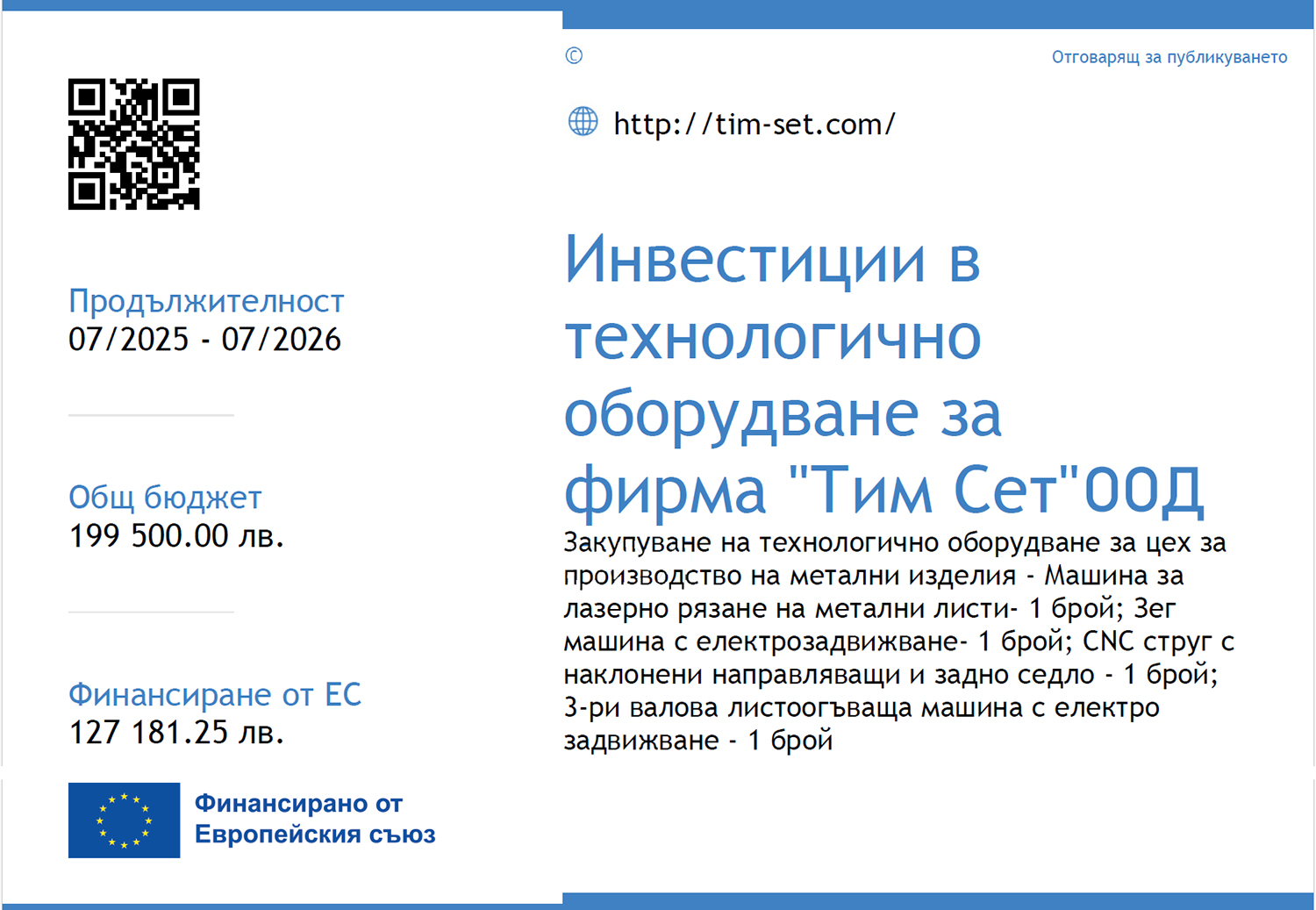 The production base of Tim Set Ltd. is located in the village of Uzundzhovo (6km away from the town of Haskovo) with 1200m2 covered and 7500m2 open production areas. The base is 10.5 meters high and is equipped with a bridge crank, a plasma cutting machine for sheet metal up to 6000x2000 mm and pipes up to diameter F400, CNC tubing machines, CNC tees, guillotine, band-cutting machines with capacity up to 600x440mm, apparatus spot welding, large powder painting chamber.